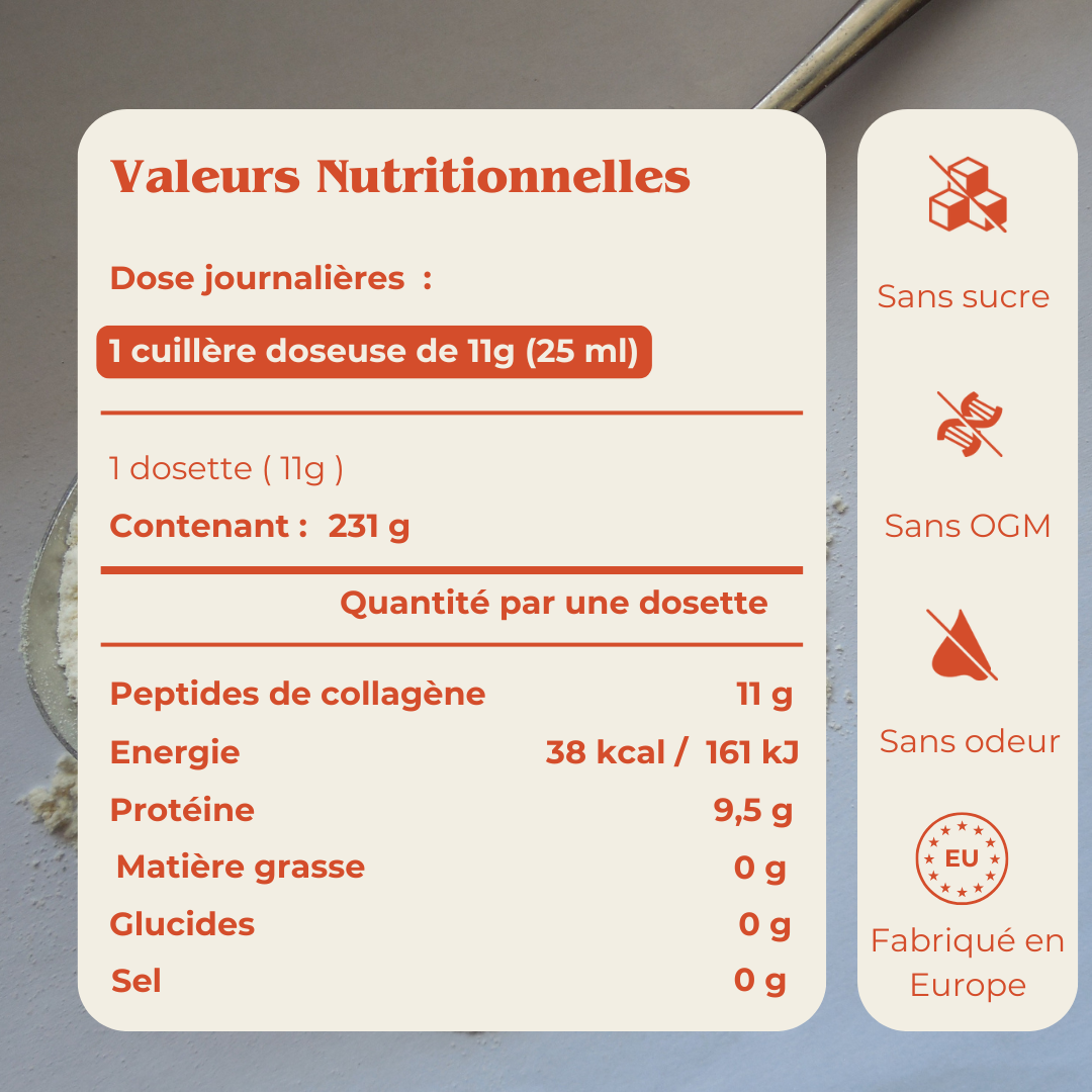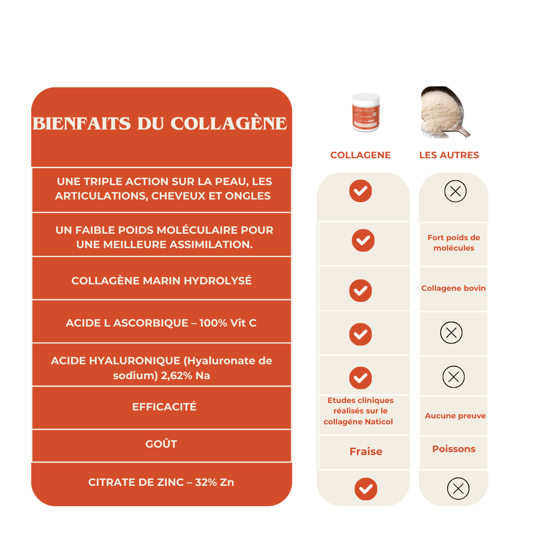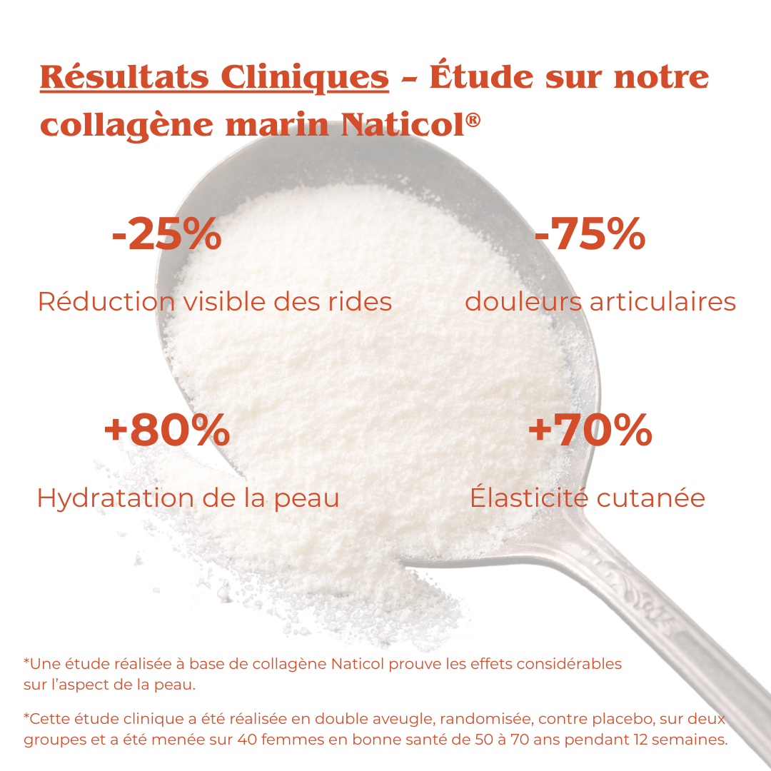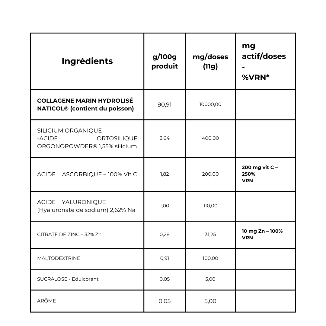 - Collagène marin hydrolysé Naticol 2000 Da (contient du poisson***) : 10 000 mg