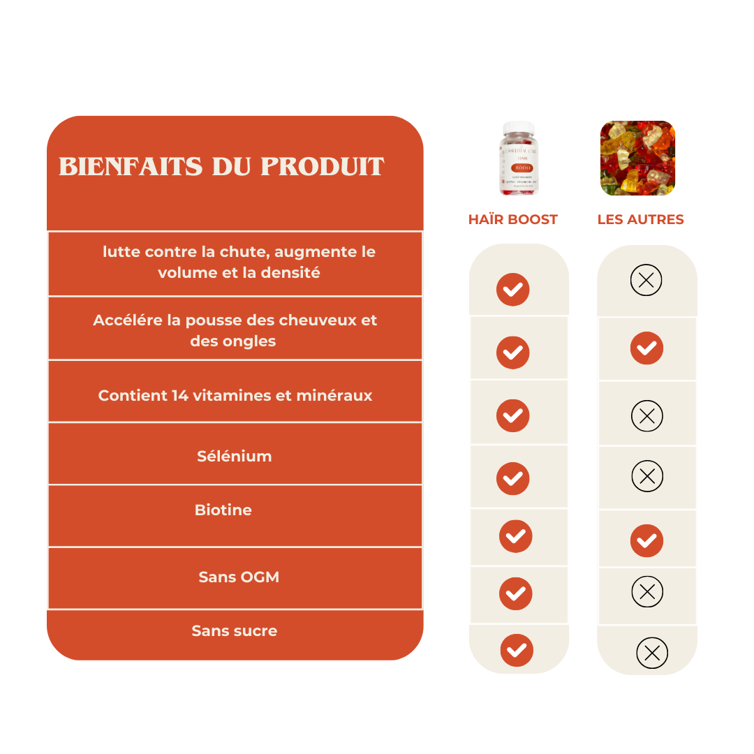 Hair Boost cible principalement les zones où les follicules pileux sont actifs et sensibles aux nutriments, comme le cuir chevelu. Aucun effet secondaire de ce type n’a été observé chez nos utilisatrices.